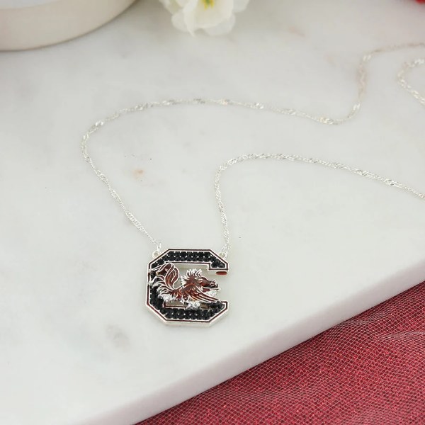 South Carolina Crystal Logo Necklace. The South Carolina Crystal Logo Necklace is part of our South Carolina Crystal Collection and features the Gamecocks logo in black crystals and garnet enamel on a 17" silver plated chain with a 2" extender.