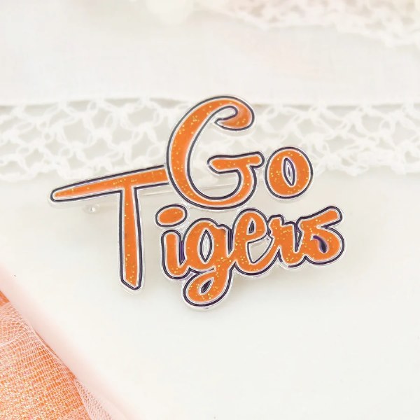 Silver tone pin featuring orange and purple enamel and the “Go Tigers” slogan. Pin measures approximately 2.25” in width.
