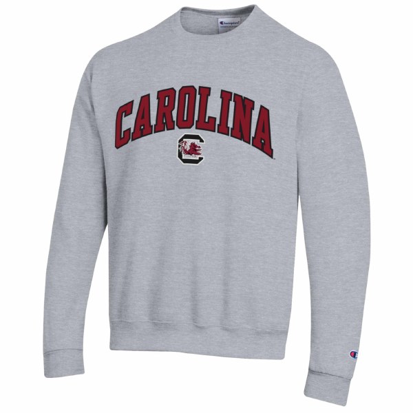 South Carolina Gamecocks Fleece Crew with Tackle Twill "CAROLINA" on HEATHER GREY. Available sizes are ADULT SM-3X.