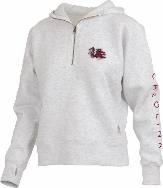 Gamecocks Ladies “BRONCO” Long Sleeve Hooded Oversized Waist-Length Fleece on HEATHER GREY. Available sizes are SM-2XL.