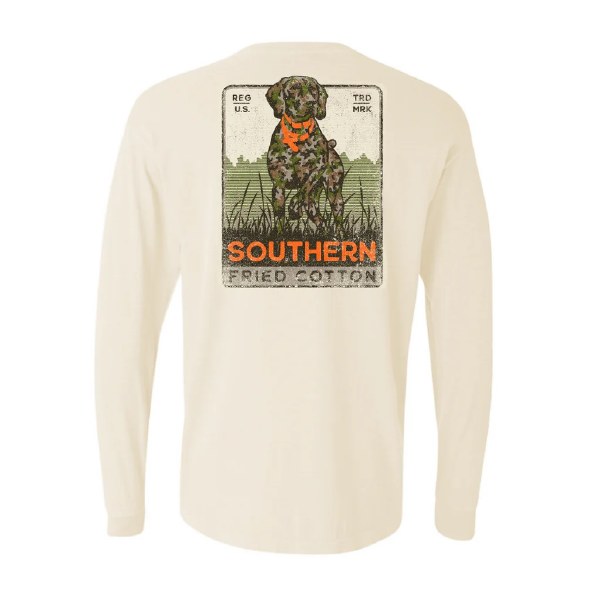 Southern Fried Old School Camo LONG sleeve T-shirt on IVORY. Design has large print on back and small print on front left chest. Available sizes are Adult SM-2X.