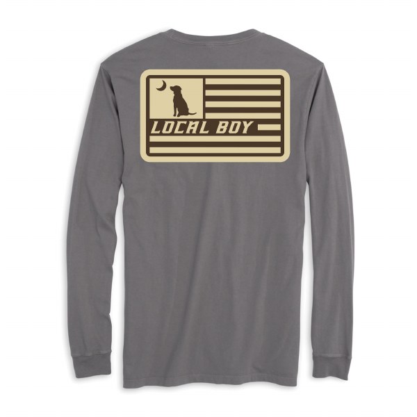 Local Boy Outfitters Flag Patch design on a LONG sleeve GRAY color T-shirt. Design has large print on back and small front left chest with pocket. Available sizes are ADULT SM-2X.
