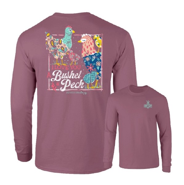 Growing up, did your mama tell you, "I love you a bushel and a peck and a hug around the neck?" This NEW Southernology® design features some our favorite farm friends & printed on a Berry long sleeve shirt. This tee would make a great gift for someone you love or wear it yourself to remind you of how loved you are! Design has large print on back and small front left chest. Available sizes are ADULT SM-2X.