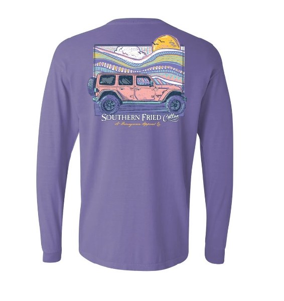 Southern Fried Go Everywhere LONG sleeve T-shirt on VIOLET. Design has large print on back and small print on front left chest. Available sizes are Adult SM-2X.