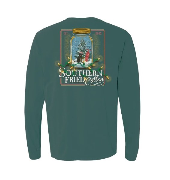 Southern Fried Snow Globe LONG sleeve T-shirt on BLUE SPRUCE. Design has large print on back and small print on front left chest. Available sizes are Adult SM-2X.