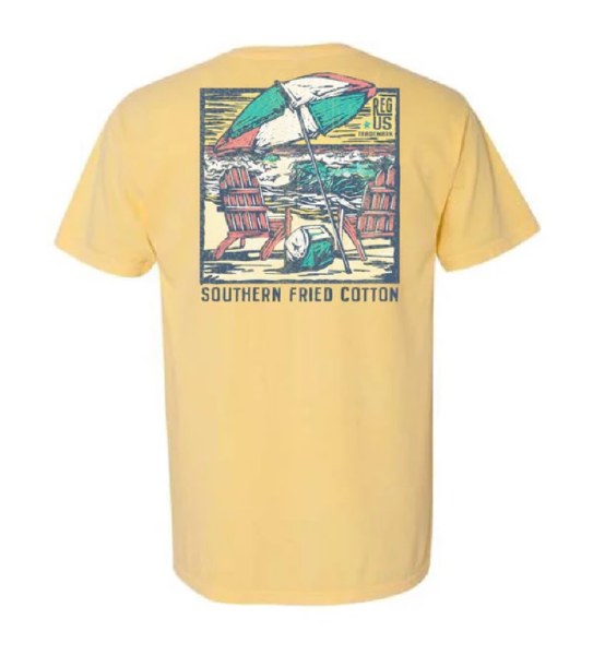 Southern Fried Cotton Water’s Edge Design on a BUTTER short sleeve shirt. Available sizes are Adult SM-2X.