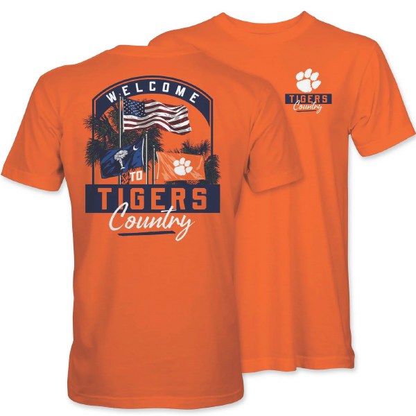 Clemson Tigers Country design on a ORANGE short sleeve T-shirt. Design has large print on back and small front left chest. Available sizes are ADULT SM-2X