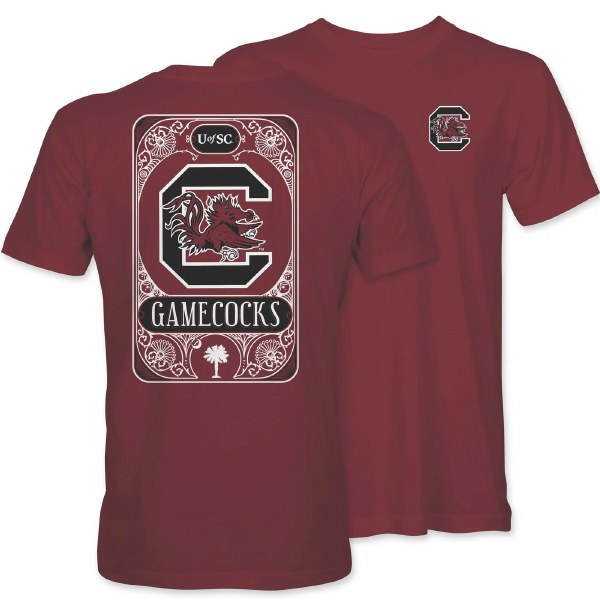 Gamecocks Tarot design on an GARNET short sleeve T-shirt. Design has large print on back and small front left chest. Available sizes are ADULT SM-2X