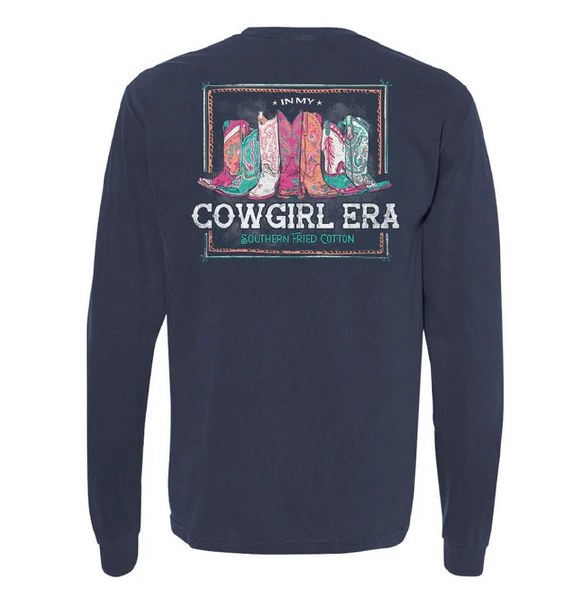 Southern Fried Cowgirl Era LONG sleeve T-shirt on DENIM. Design has large print on back and small print on front left chest. Available sizes are Adult SM-2X.