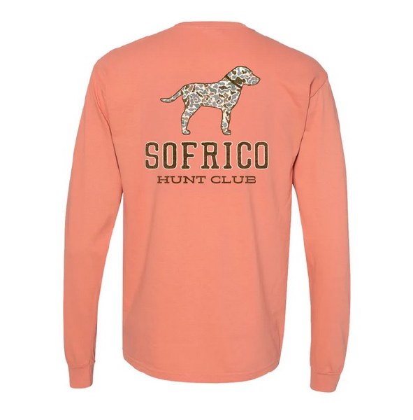 Southern Fried Camo Hound LONG sleeve T-shirt on TERRACOTTA. Design has large print on back and small print on front left chest. Available sizes are Adult SM-2X.