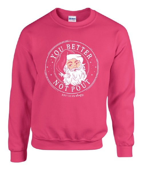 You better not pout 'cause Santa is coming to town! Stay cozy and festive this holiday season in our NEW Southernology® crew featuring the cutest Santa. Printed on a pink lemonade Gildan crewneck sweatshirt. Design is FRONT PRINT ONLY. Available sizes are ADULT SM-2X.