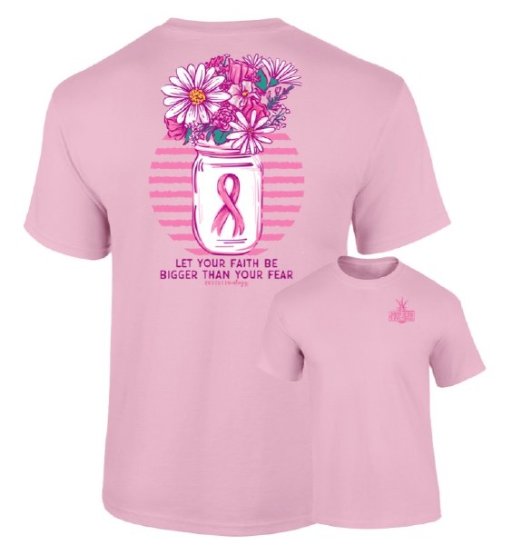 Let your faith be bigger than your fear! Wear this shirt to show support to all the ones fighting against breast cancer!! This NEW Southernology® tee is printed on a blossom Comfort Color tee. Design has large print on back and small front left chest. Available sizes are ADULT SM-2X.