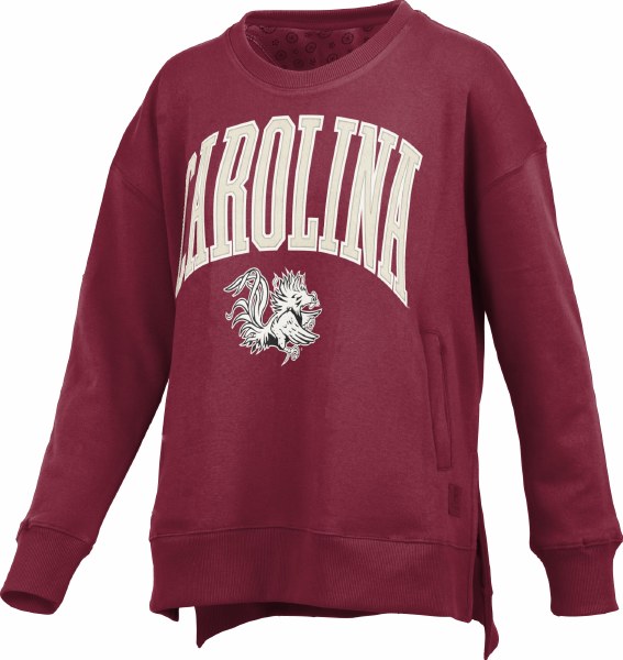 Gamecocks Ladies “VENICE” Long Sleeve Crew-Neck Side Pocket HiLo Fleece on GARNET. Available sizes are SM-2XL.
