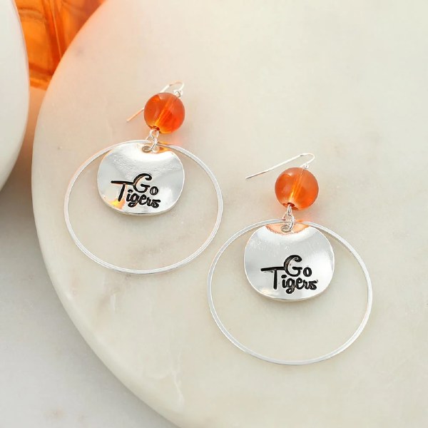 Silver tone shepherd hook earrings featuring a dangling “Go Tigers" slogan disc with an orange bead accent and silver tone hoop. Slogan disc measures 1" in diameter. Hoop measures 1.75" in diameter.