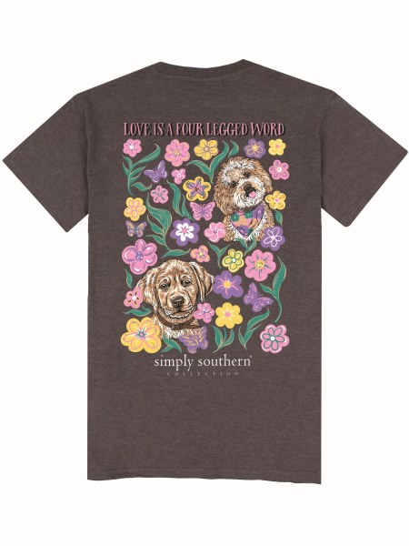 Dark heather grey short sleeve shirt with the phrase 'Love is a four legged word' and two dogs in a collection of bright flowers. Simply Southern logo below and on left chest. 98% cotton / 2% polyester blend. Unisex sizing.
