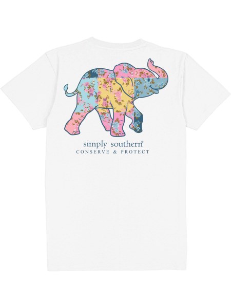 White short sleeve shirt with the silhouette of an elephant filled with floral quilted patches. Simply Southern logo below and on left chest. 100% cotton. Unisex sizing. Elephant tracker.