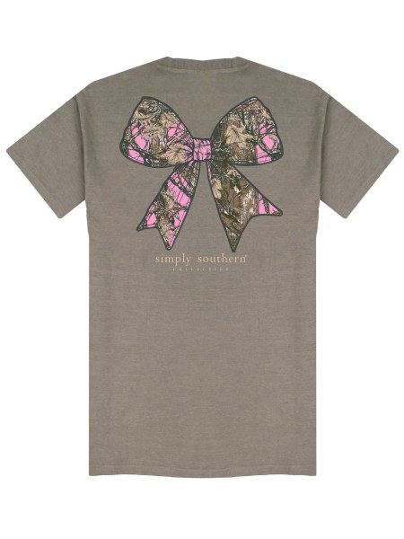 Dark heather brown short sleeve shirt with a large pink camo bow. Simply Southern logo below and on left chest. 52% cotton / 48% polyester blend. Unisex sizing.