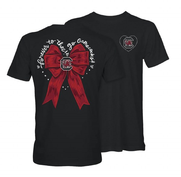 South Carolina Gamecocks Bow Logo design on a BLACK short sleeve T-shirt. Design has large print on back and small front left chest. Available sizes are ADULT SM-2X.