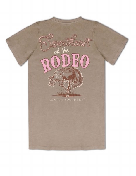 Mineral washed umber short sleeve shirt with the phrase 'Sweetheart of the rodeo' and a bucking horse. Simply Southern logo below. Similar design on left chest. 100% cotton. Unisex sizing.