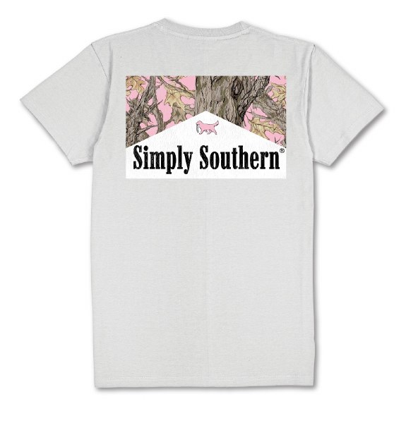Light grey short sleeve shirt with the Simply Southern logo topped with pink camo print. Similar design on left chest. 100% cotton. Unisex sizing.