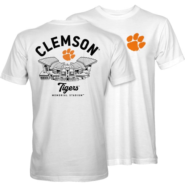 Clemson Tigers Stadium design on a WHITE short sleeve T-shirt. Design has large print on back and small front left chest. Available sizes are ADULT SM-2X.