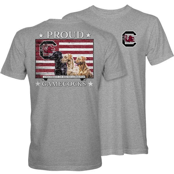 Gamecocks Proud Gamecocks Labs design on a SPORT GREY short sleeve T-shirt. Design has large print on back and small front left chest. Available sizes are ADULT SM-3X.