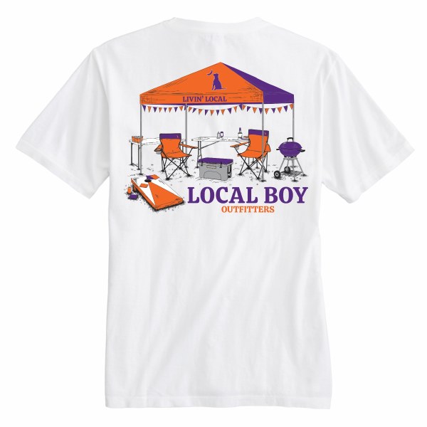 Local Boy Outfitters Tailgate Scene design on a WHITE short sleeve T-shirt. Design has large print on back and small front left chest. Available sizes are ADULT SM-2X. Crafted From 100% Cotton and a Traditional Fit, LOCAL BOY T-Shirts are made with comfort and Style in mind. Featuring a left chest pocket with a LOCAL BOY Logo and Bold design on the back, our T-Shirts are wardrobe essentials.