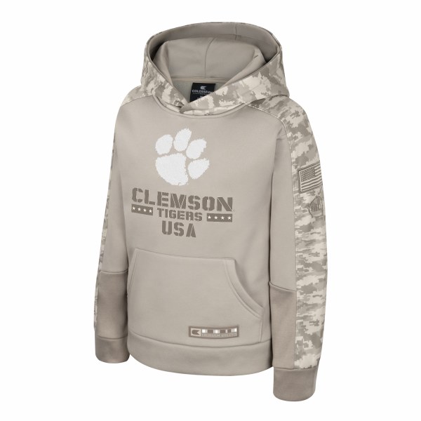 Clemson Youth OHT Battalion Pullover Hoodie on DUNE/MOJAVE CAMO. Available sizes are YXS-YXL.